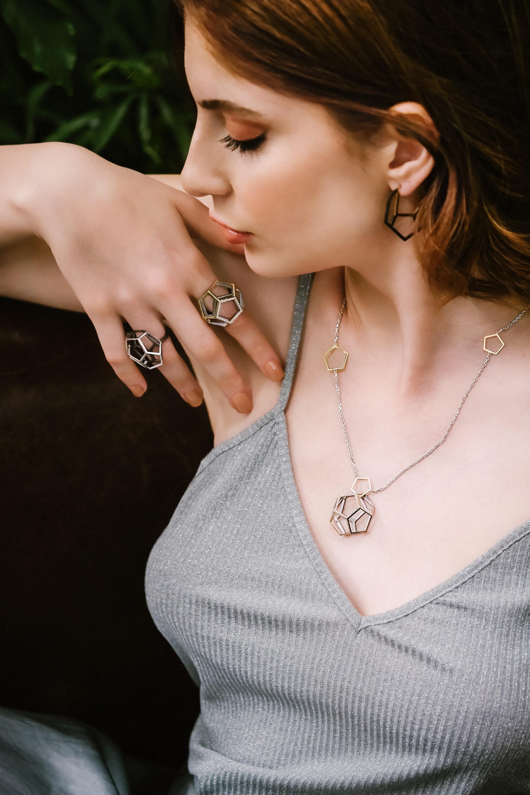 Geometrik formların enerjisine inanan C|ND|N; Petek Koleksiyonu’nda kapasitesi yüksek ve sağlam bir geometrik şekil olan beşgene odaklanıyor. Altın ve gümüşün birlikte kullanıldığı koleksiyon parçaları; hem klasik hem de günlük kombinlerin vazgeçilmezi olmaya aday.